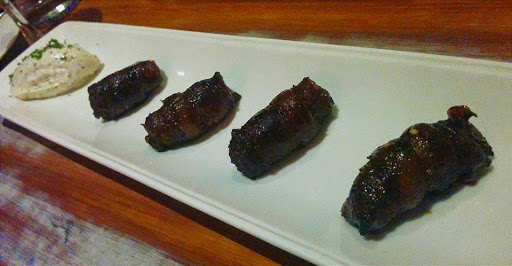 | Bacon and Parmesan wrapped Dates with Mustard Creme Fraiche |