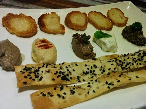 A platter of bread and an assortment of dips/spreads: Hummus, Mushroom PâtĂ©, Chicken liver PâtĂ©, Olive Tapenade and Tzatziki soon arrived at our table. We personally loved the garlic-infused Hummus (It’s a classic!) the Olive Tapenade and Chicken Liver PâtĂ© – this, despite not being a fan of any liver preparations.