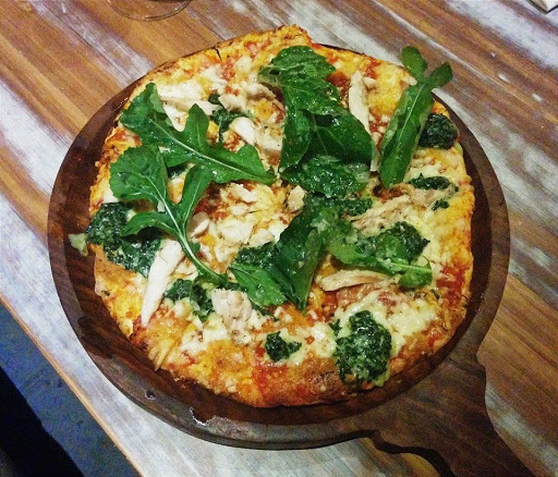 Pizza Terttulia-aah! – Some creamy spinach, tossed rucola scarmoza ‘n parmigiano drizzled with olive oil and some chicken (optional) is all you need to create this beautiful, light pizza that we loved as soon as we took the first bite. A slim, crisp base makes for a treat for those who like their pizza super thin!