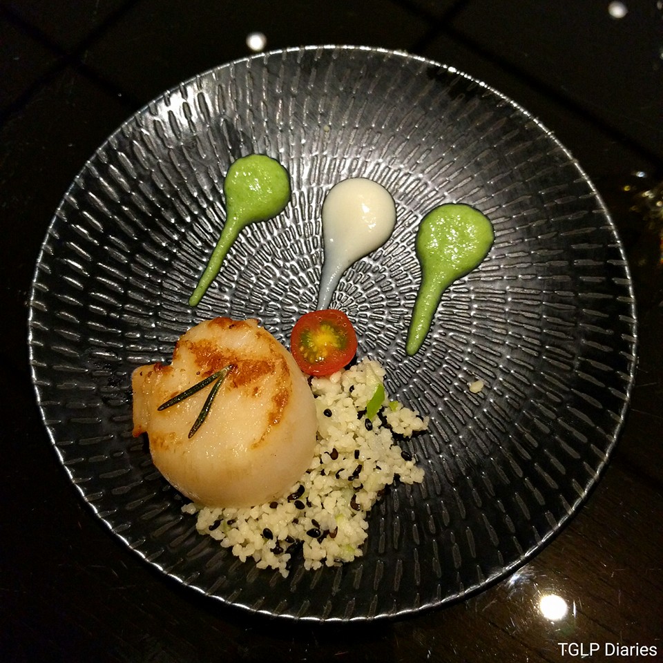 Pan seared Atlantic Scallops with broccoli and cauliflower puree, served with couscous and black sesame seeds topped with a grilled cherry. Sounds as fascinating as it tasted. The flavours are highly subtle (mild for those who like potent flavours) and this one’s worth a shot if you are capable of enjoying minimalistic bland food.